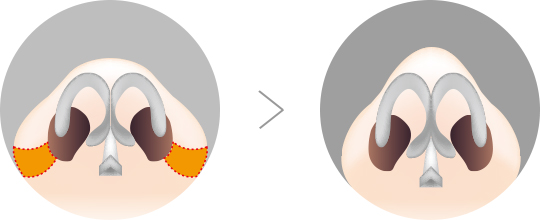 콧망울이 크고 옆으로 넓게 퍼져있는 경우에 콧구멍이 커 보이고 코가 낮지 않음에도 불구하고 낮아 보여 인상이 둔해 보일 수 있습니다. 이러한 경우 콧망울의 전체적인 넓이를 줄여줌으로써 이상적인 코 모양으로 바로 잡아줍니다. 또한 콧구멍의 모양과 넓이, 콧망울의 길이, 코끝까지의 거리 등을 고려하여 콧대높이기나 코끝 성형을 병행하면 더욱 만족스러운 라인을 완성할 수 있습니다.