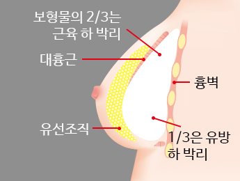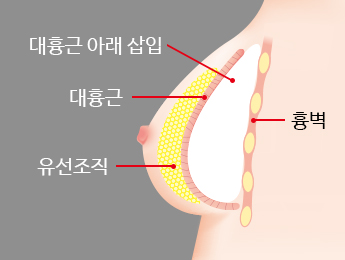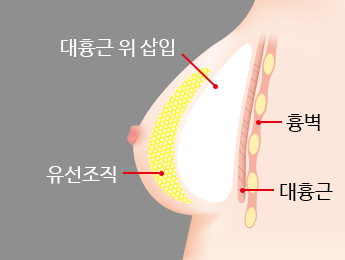 근육 밑 삽입 : 가슴근육인 대흉근 아래 보형물 삽입