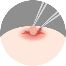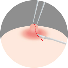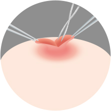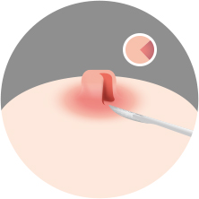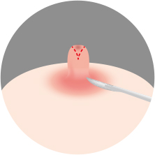 유두 주변을 국소마취 한 후 양쪽을 절개하여 유두를 끌어당기는 섬유조직을 이완시킵니다.