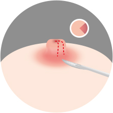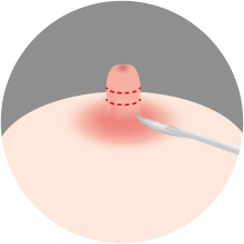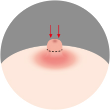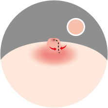 유두의 뿌리 부분의 피부를 약 1~1.5㎜ 정도 잘라내고 유두를 유륜에 봉합하여 길이를 줄여줍니다.