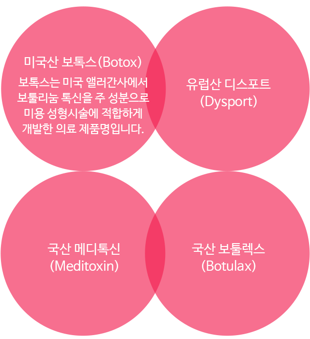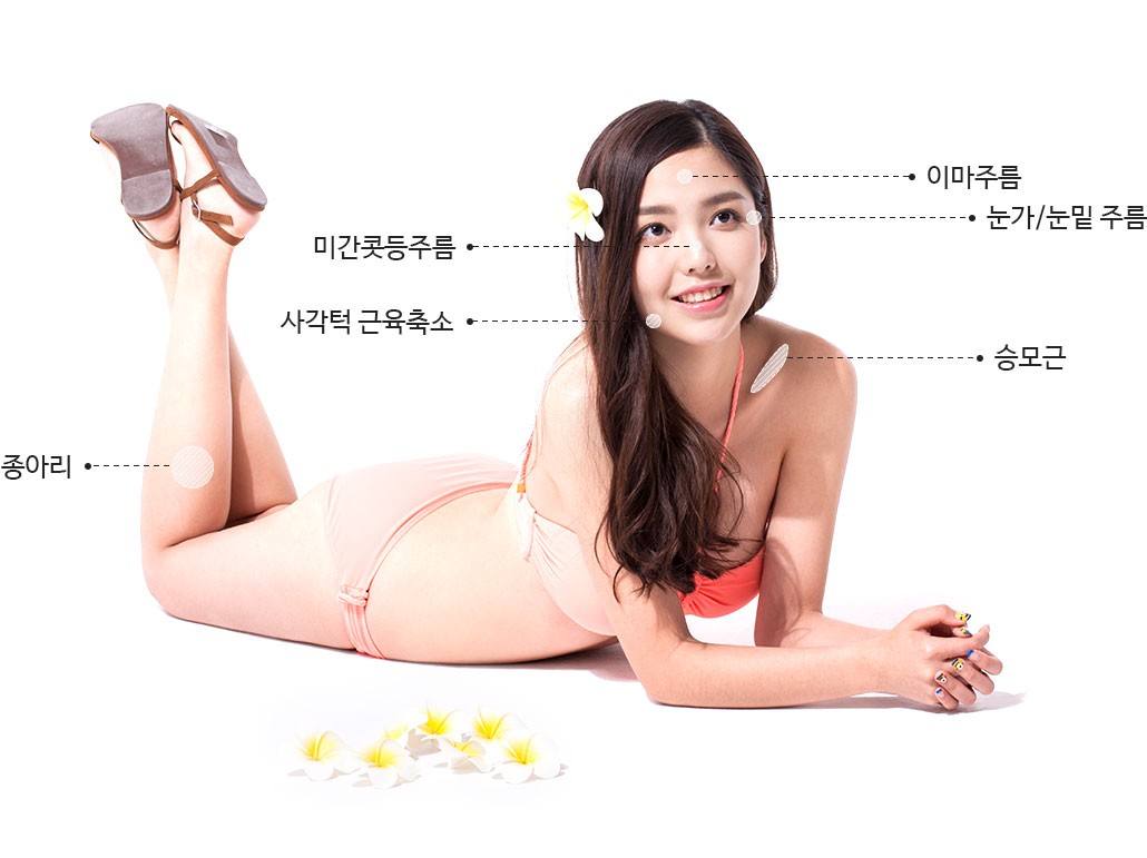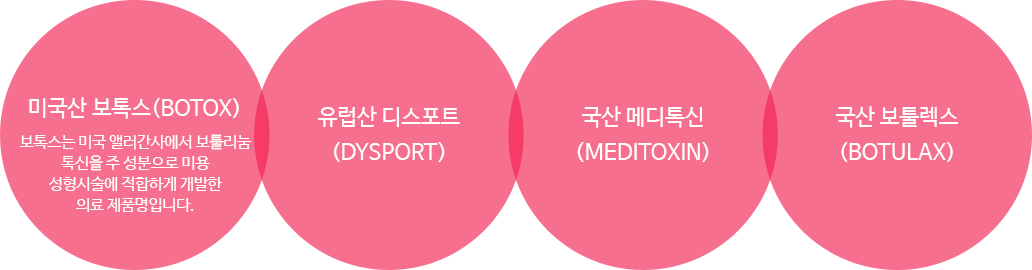 보툴리눔이라는 신경독소를 이용하여 주름과 근육이 발달한 곳에 정확하게 진단하여 주입함으로써 수술 없이도 시술부위의 개선효과를 볼 수 있습니다. 보톡스는 일반적으로 4~6개월 정도 효과가 지속되며, 시술시간은 5분 내외로 바로 일상생활이 가능합니다.