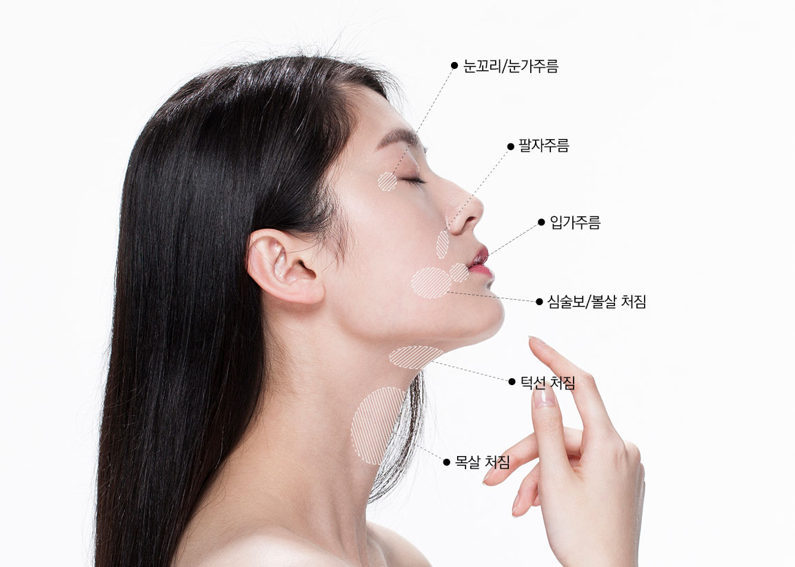 볼처짐과 팔자주름, 눈가주름, 입가주름이 심한