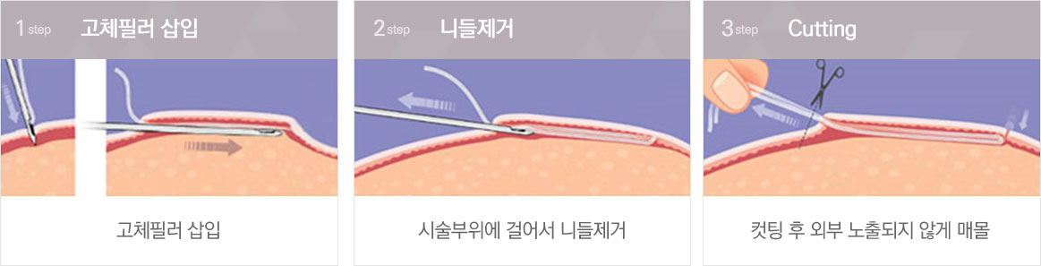 고체필러는 기존 필러시술이 불가능했던 부위, 시술로 효과를 보기 어려웠던 입 주위, 팔자주름, 심술보, 이마주름, 미간주름 부위에 실리프팅과 기존 필러의 단점을 완벽하게 보완한 고체필러를 주입하여 고밀도 자가조직 생성을 유도합니다. 액체 필러와 달리 일정기간이 지나도 시술 위치에 지속적으로 고정되어 변형이 잘 일어나지 않습니다.