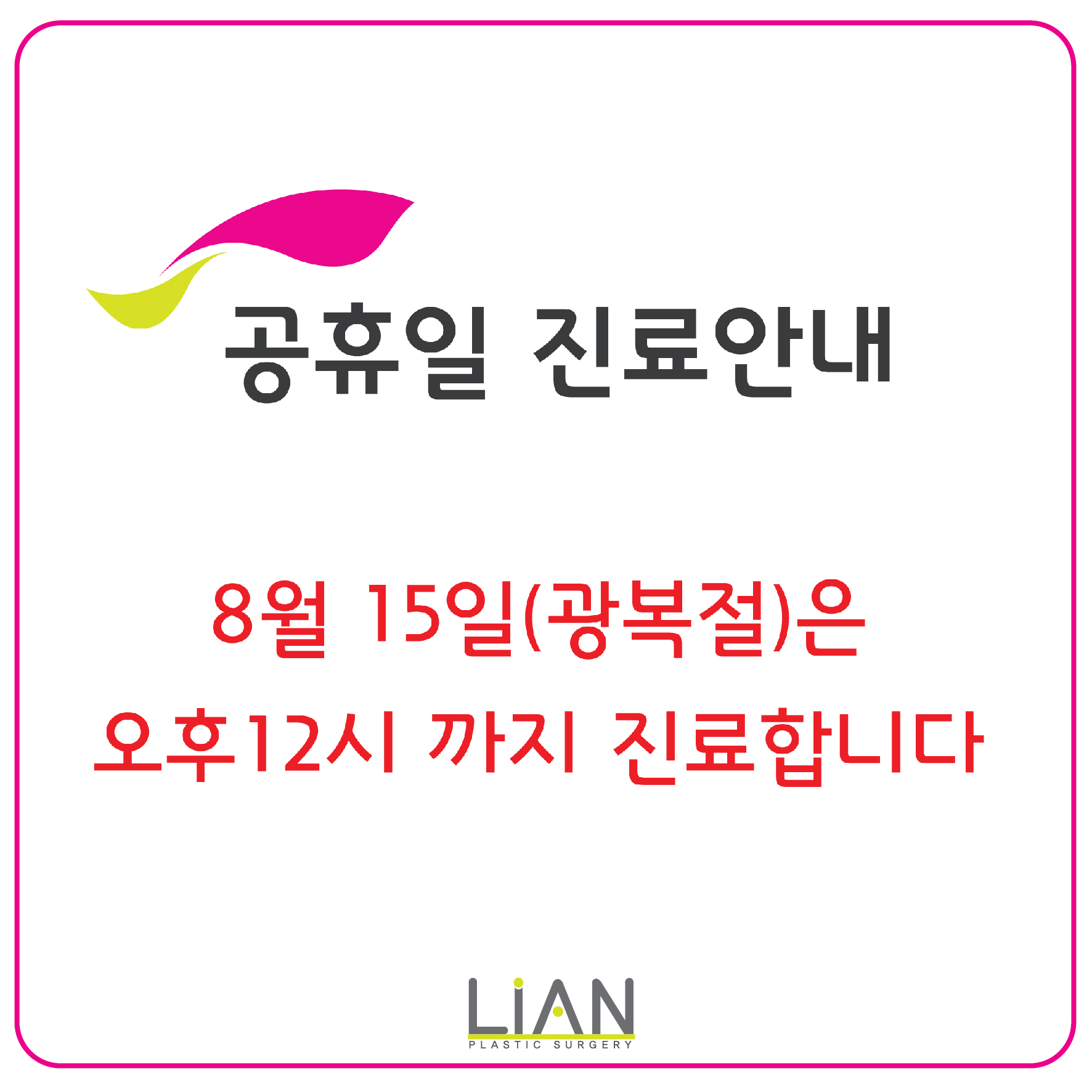 <리안성형외과 8월 15일 광복절 진료안내> 8월 15일 토요일 광복절은 오후 12시까지 진료합니다. 전날인 8월 14일은 정상진료 합니다.